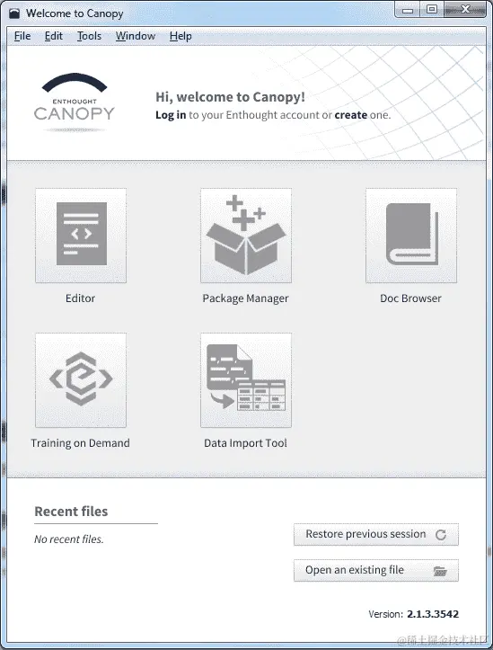 安装程序设置完成您的 Python 环境后,您应该会看到下面的屏幕。它会显示欢迎来到 Canopy 和一堆友好的大按钮: