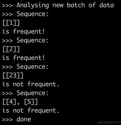 如果你打字速度很慢,或者在 10 秒窗口快要结束时开始打字,输出可能会分成更多部分。看看实际的输出,你会发现经常讨论的首页和新闻,由类别 1 和 2 表示,是频繁的。此外,由于 23 不是原始数据集中包含的序列项,它不能是频繁的。最后,序列<4, 5>显然也不频繁,这是我们以前不知道的。