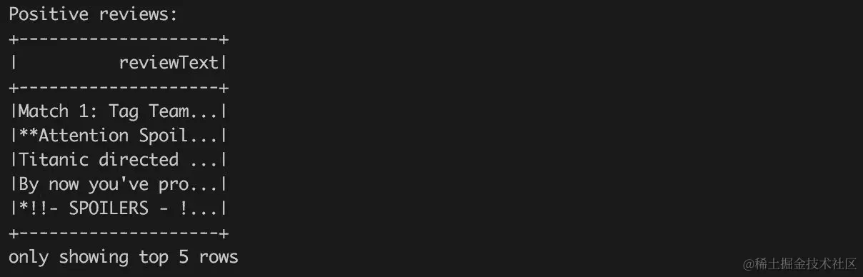 positiveReviews.show(5, truncate = true)