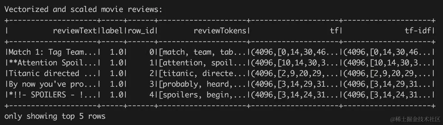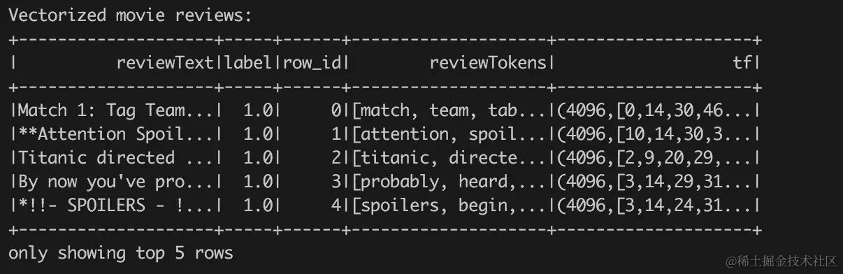 为什么我们使用双精度值而不是字符串标签表示?在代码标记单个评论时,我们使用了表示双精度数字的数字文字来定义一个常量列。我们也可以使用*lit("positive")*来标记积极的评论,但是使用纯文本标签会迫使我们在后续步骤中将字符串值转换为数值。因此,在这个例子中,我们将直接使用双精度值标签来简化我们的生活。此外,我们直接使用双精度值,因为 Spark API 要求这样做。