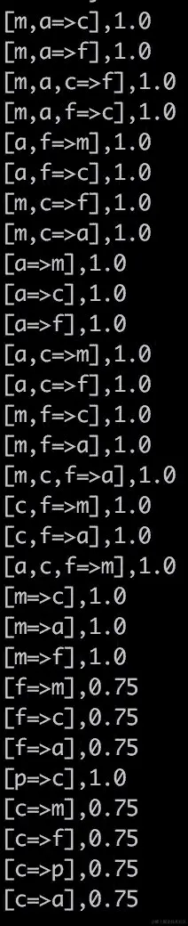 由于这是我们迄今为止考虑的比较复杂的 RDD 操作之一,让我们讨论一下涉及的所有步骤。我们首先将每个频繁序列映射到一个由其长度和序列本身组成的对。这一开始可能看起来有点奇怪,但它允许我们按长度对所有序列进行分组,这是我们在下一步中要做的。每个组由其键和频繁序列的迭代器组成。我们将每个组映射到其迭代器,并通过仅保留具有最大频率的序列来减少序列。然后,为了正确显示此操作的结果,我们两次使用mkString来从否则不可读的嵌套数组(在打印时)中创建字符串。前述链的结果如下: