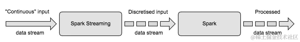 Spark Streaming 应用程序的核心抽象是“DStream”的概念,它代表“离散流”。为了解释这个术语,我们经常将数据流想象为连续的事件流,当然,这是一个理想化的想法,因为我们所能测量的只是离散的事件。无论如何,这连续的数据流将进入我们的系统,为了进一步处理它,我们将其离散化为不相交的数据批次。这个离散数据批次流在 Spark Streaming 中被实现为 DStream,并且在内部被实现为一系列 RDD。