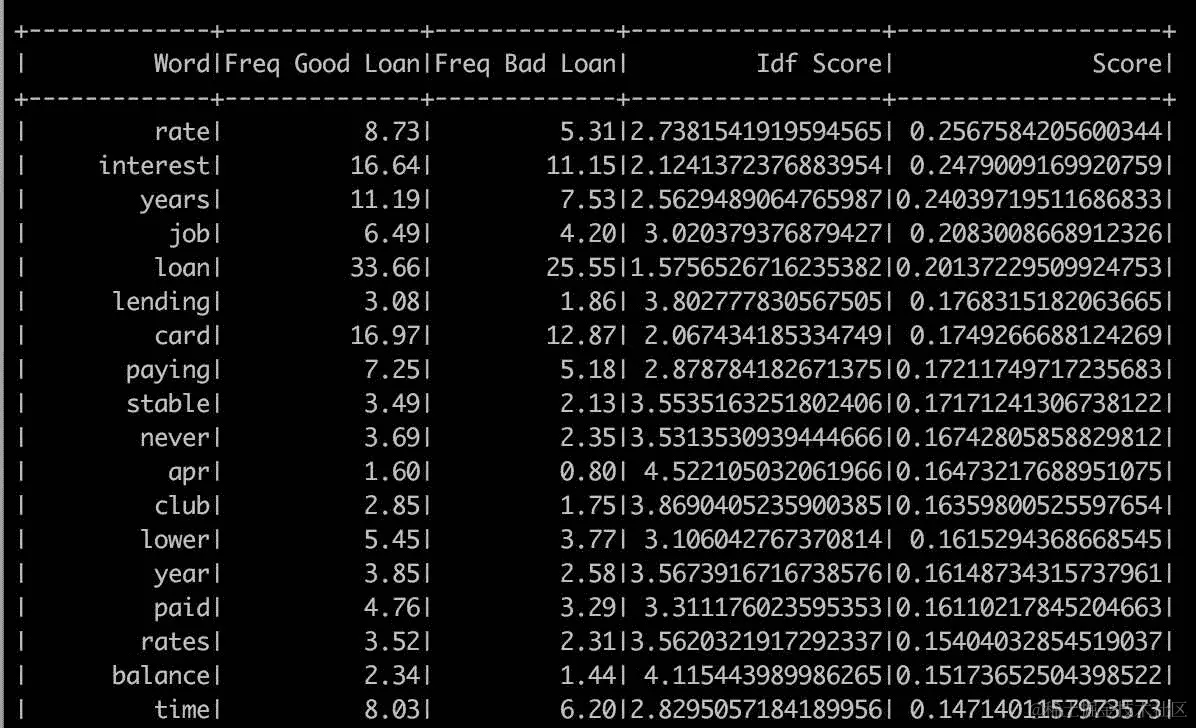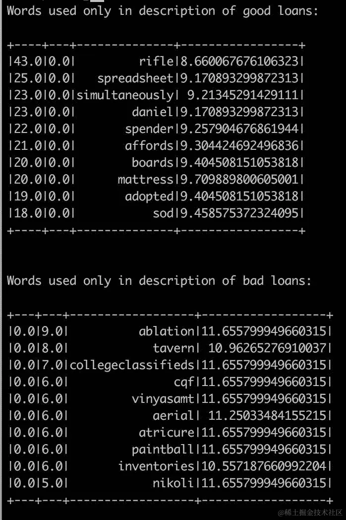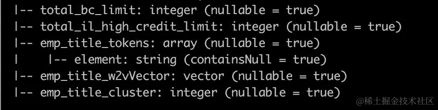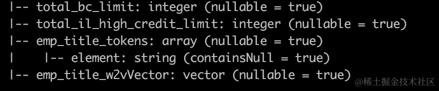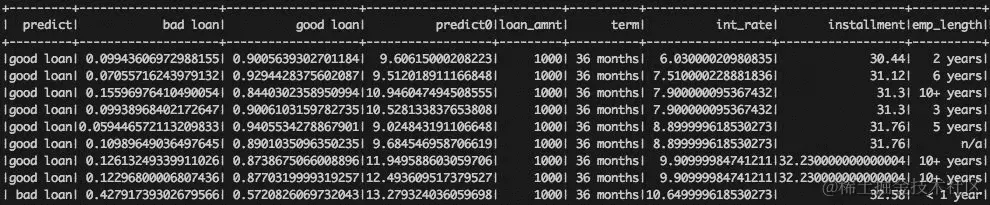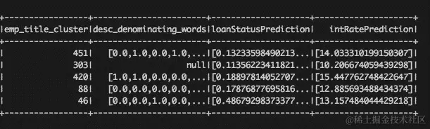 我们可以看到模式中有几个新字段:empTitle 集群的表示,命名词向量和模型预测。概率来自贷款状态模型,实际值来自利率模型。