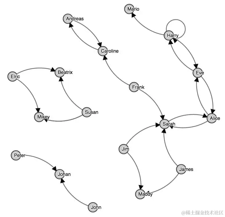图 8:一个稍微复杂的社交多重图,带有环和多重边。