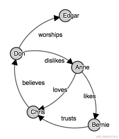 在本章的其余部分,我们将使用以下约定来表示属性图。附加到顶点的额外数据称为顶点数据,附加到边的数据称为边数据。为了举例更复杂的顶点和边数据,请参见以下图表,扩展了我们扩展朋友图的想法。这个例子也展示了我们所说的三元组,即带有其相邻顶点及其所有属性的边: