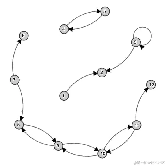 我们可以立即看到它有三个连接的组件,即三组顶点*{1, 2, 3}, {4, 5}, 和 {6, 7, 8, 9, 10, 11, 12}。至于强连接组件,这需要比快速的视觉检查更多的努力。我们可以看到{4, 5}形成了一个强连接组件,{8, 9, 10, 11}*也是如此。其他六个顶点形成了自己的强连接组件,也就是说,它们是孤立的。这个例子继续说明,对于一个有数百万个顶点的大图,通过正确的可视化工具,我们可能会幸运地找到大致连接的组件,但强连接组件的计算会更加复杂,这正是 Spark GraphX 派上用场的一个用例。