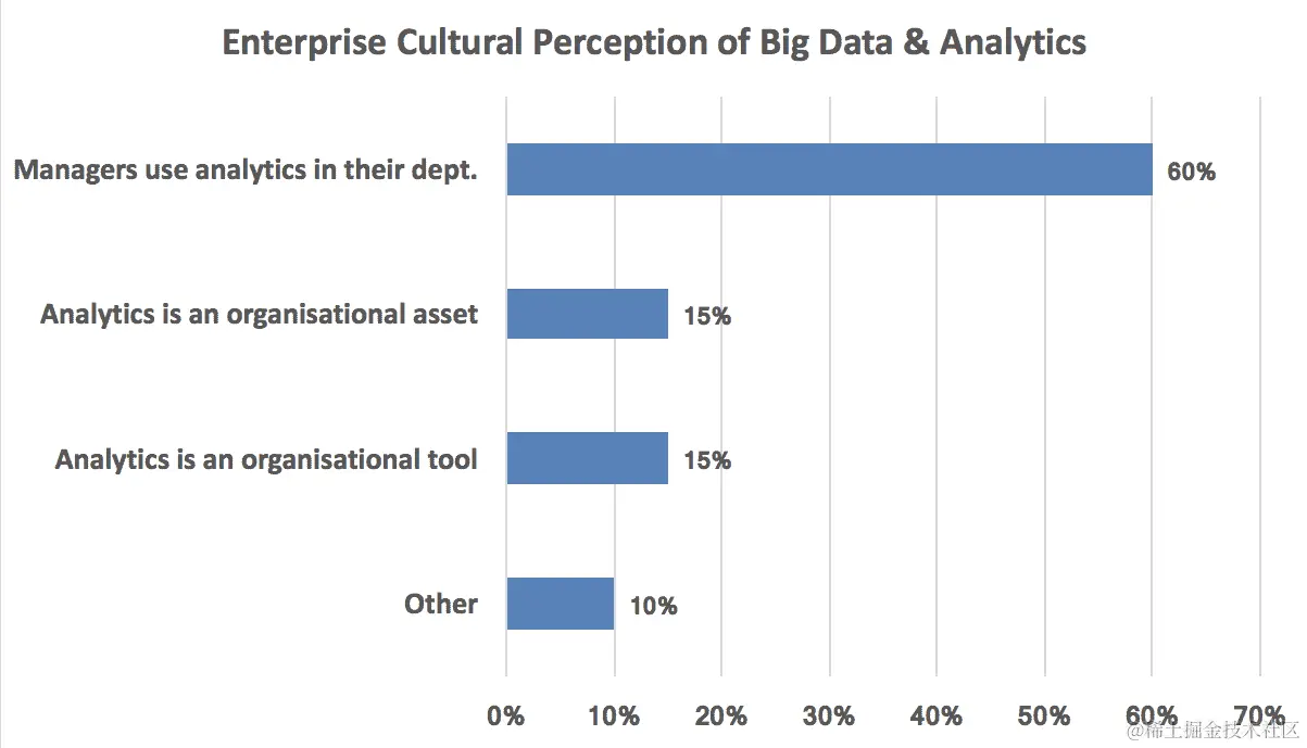 组织对大数据作为企业要求的认识和接受的另一个方面是对这种工具效用的文化认知。在对大型公司的 C 级管理层进行的调查中,大多数受访者表示他们的部门经理正在使用分析,但并不是所有部门都有统一的参与水平,如下图所示:
