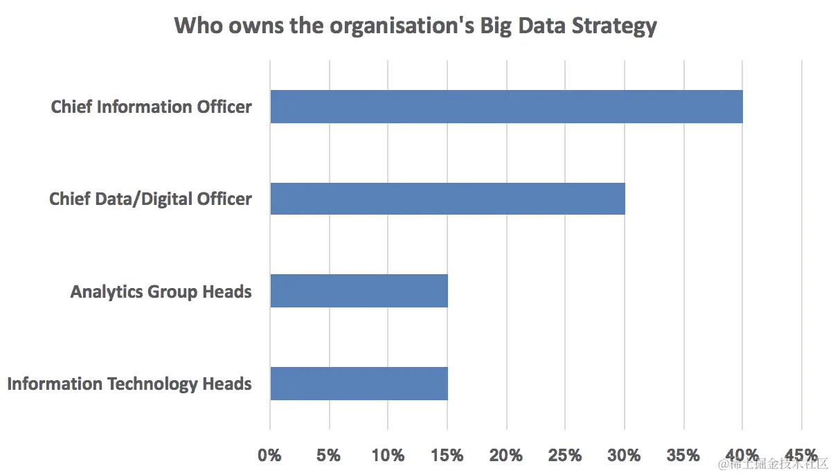 在对组织中的大数据和数据科学代表进行的一般调查中,我们观察到,在大多数情况下,首席信息官或首席数据/数字官负责企业大数据战略,如下图所示: