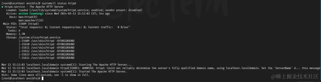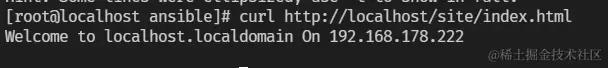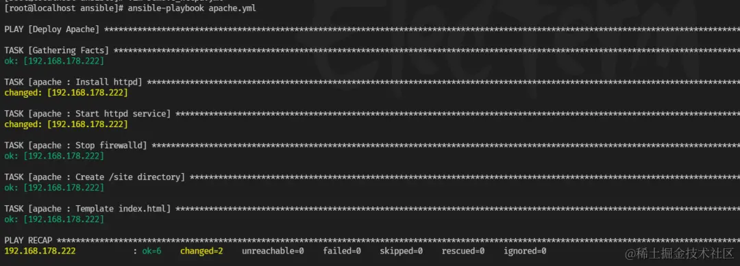 一旦 playbook 运行完成,你可以登录到目标机器上检查 Apache 是否已正确安装、启动,并且 /site/index.html 文件是否已正确创建。