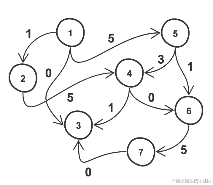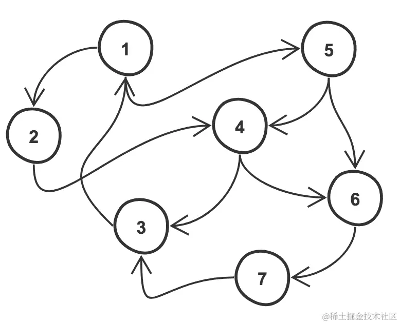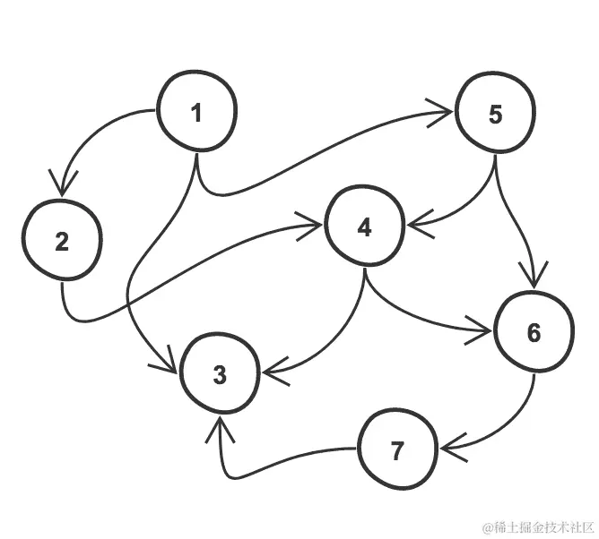 - 有向无环图:这是一个没有循环的有向图。这是最常见的图的类型。在下面的例子中,节点是1、2、3、4、5、6、7,边是{(1, 2), (1, 3), (1, 5), (2, 4), (4, 3), (4, 6), (5, 4), (5, 6), (6, 7), (7, 3)}: