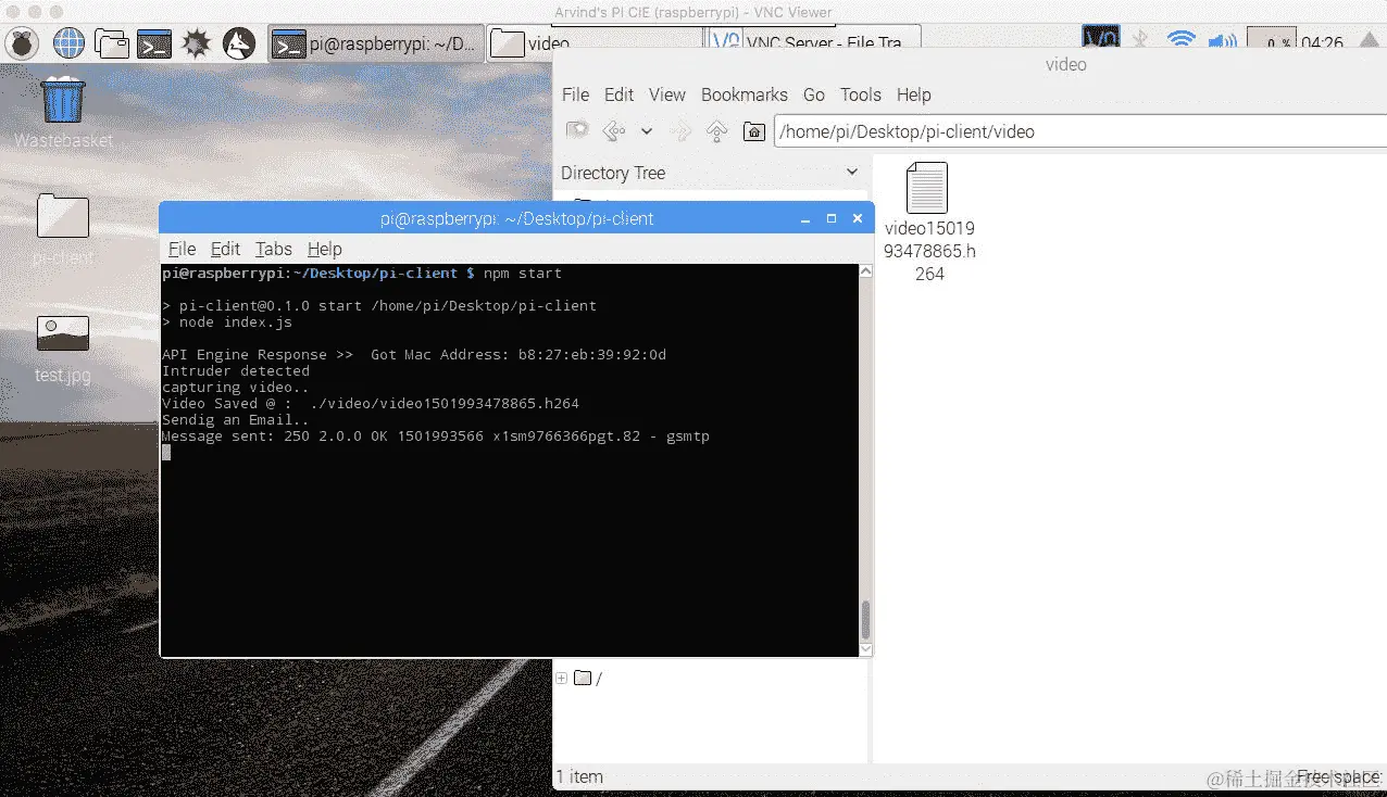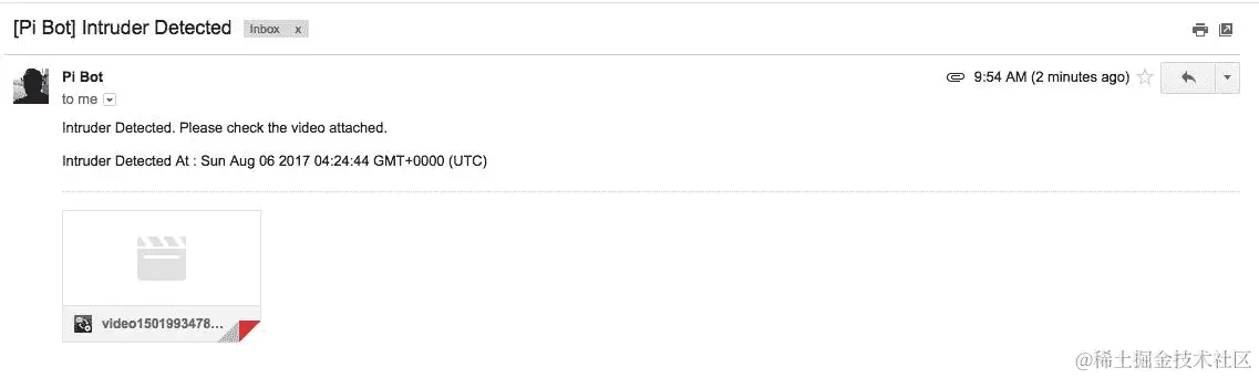 从上述代码中可以看出,我们已将 GPIO 17 标记为输入引脚,并将其分配给名为pir的变量。接下来,使用pir.watch(),我们不断查看运动检测器的值是否发生变化。如果运动检测器检测到某种变化,我们将检查值是否为1,这表示触发了运动。然后使用raspivid我们录制一个 5 秒的视频并通过电子邮件发送。