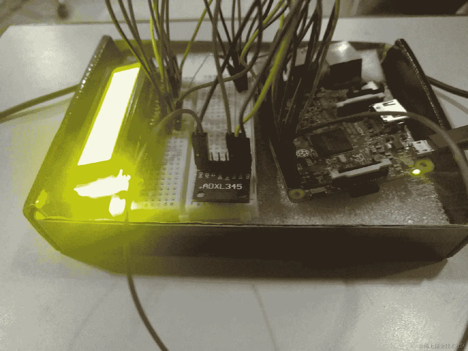 关于硬件设置的第一件事是它又大又笨重。这只是一个 POC,甚至不是一个接近生产设置的远程。硬件设置将包括连接到树莓派 3 和 16X2 LCD 的加速度计。
