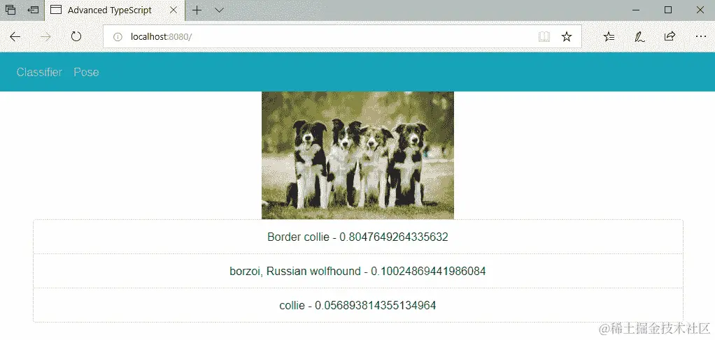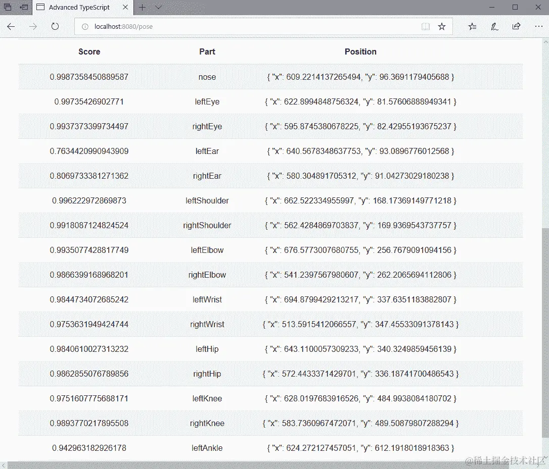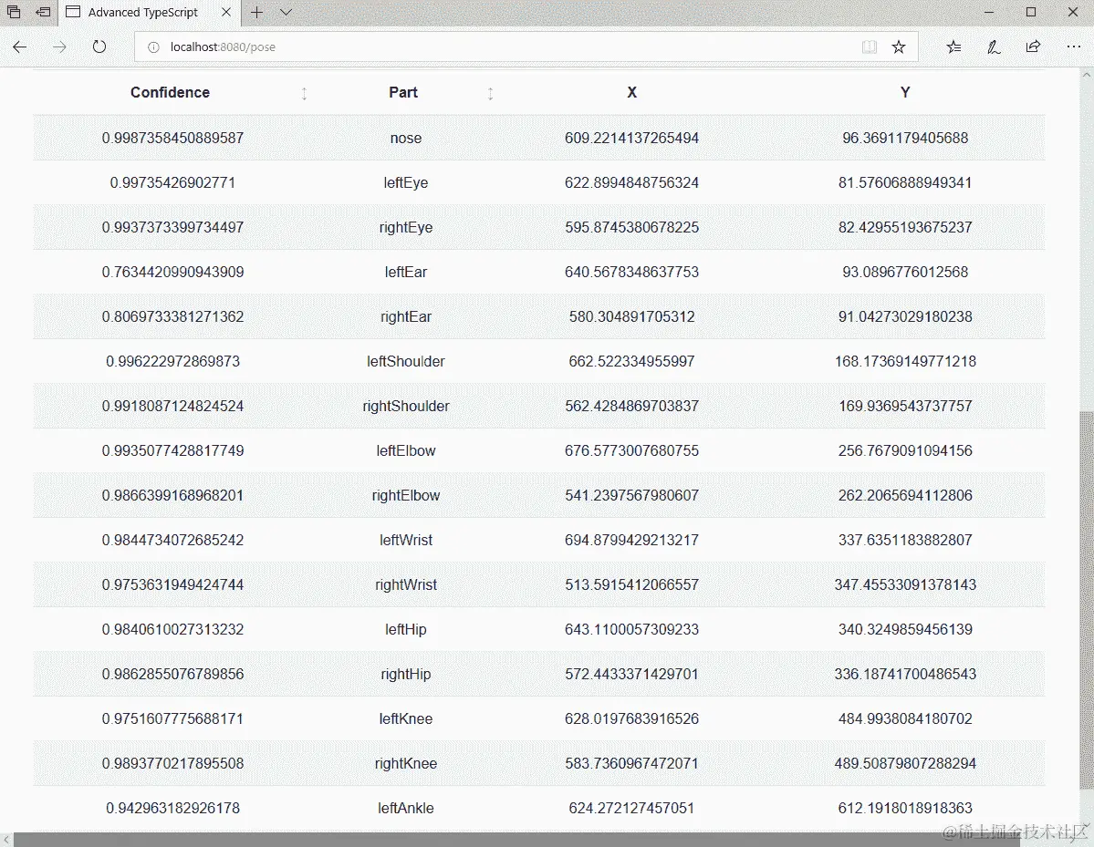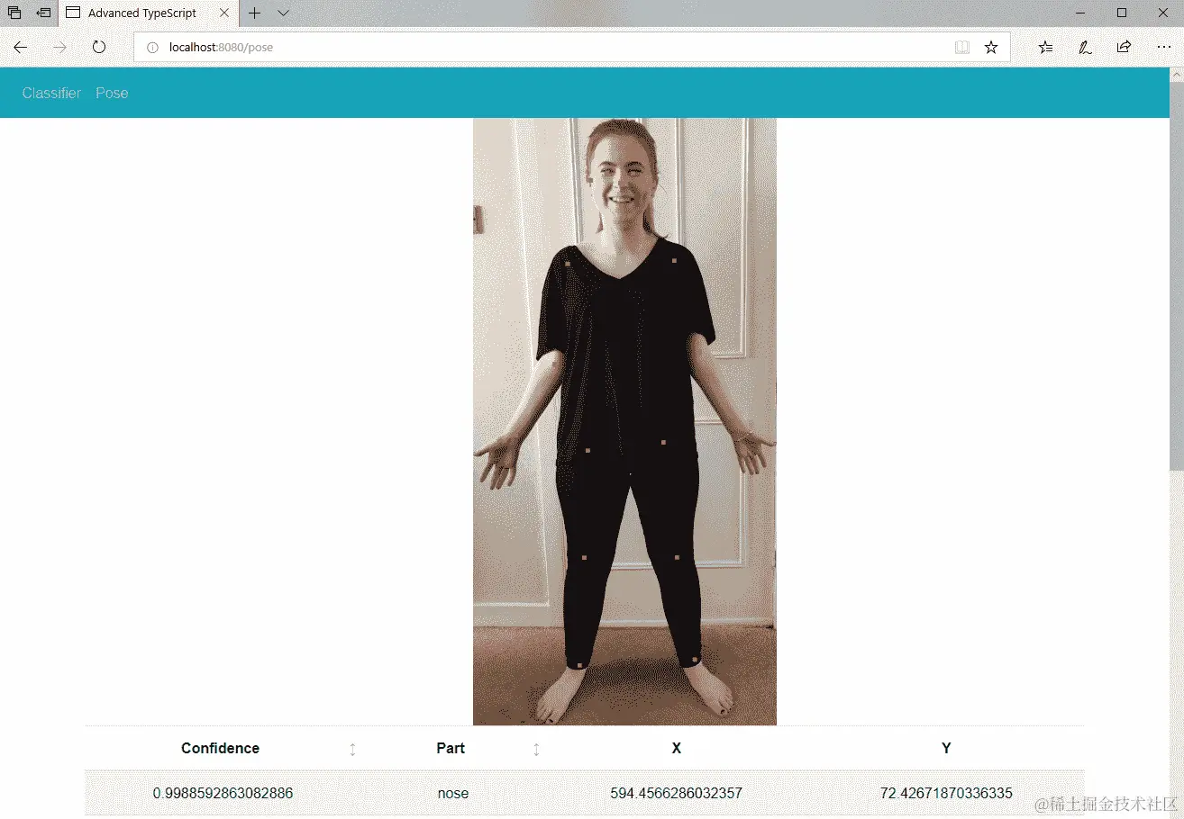 一旦我们有了图像引用,我们将它们转换为适当的HTMLImageElement和HTMLCanvasElement类型,然后调用Pose方法,并用结果值填充我们的keypoints成员: