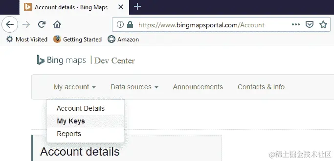 当我们登录时,我们需要创建一个密钥,我们的应用程序将使用它来向必应地图服务标识自己,以便他们知道我们是谁,并可以跟踪我们的地图使用情况。从“我的帐户”选项中,选择“我的密钥”: