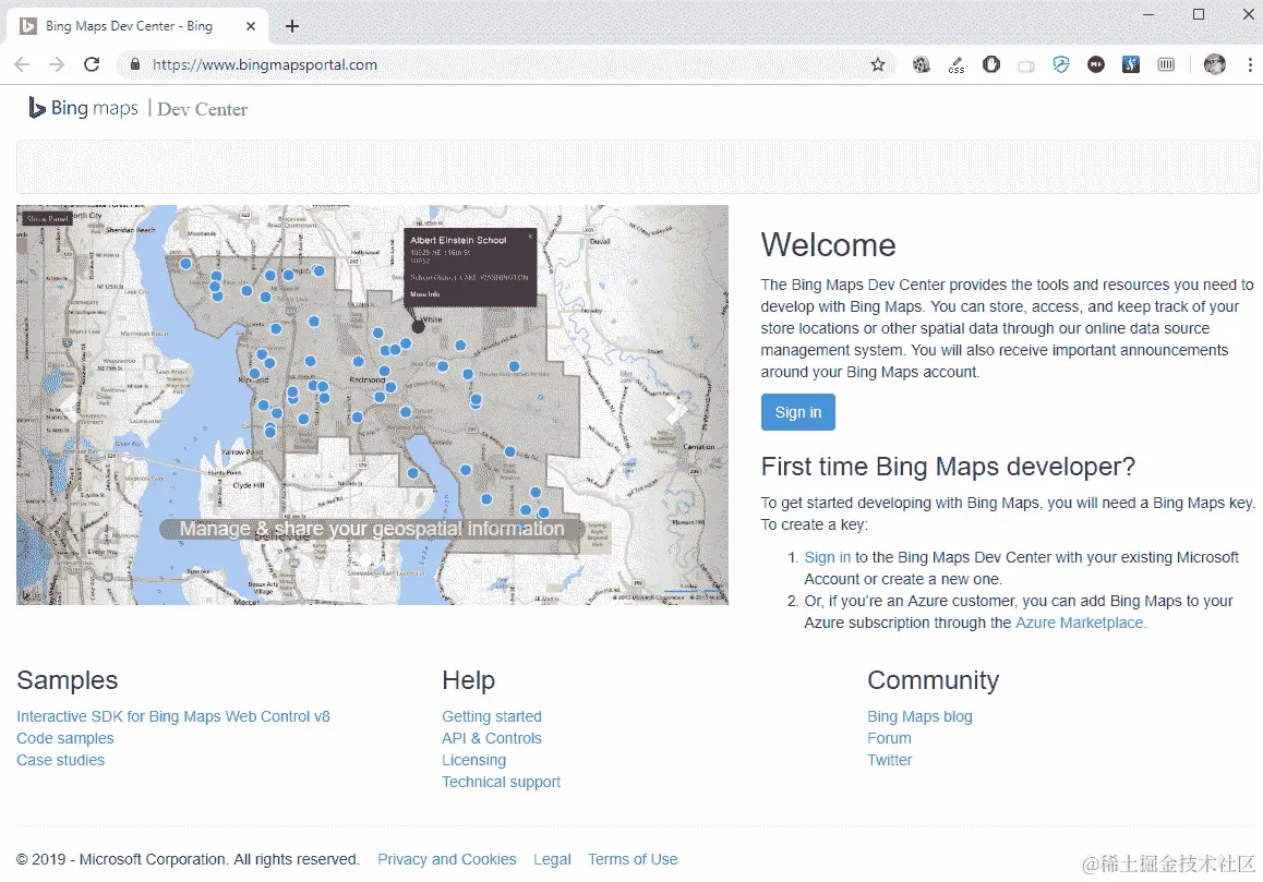 如果我们想要使用必应地图,我们必须注册必应地图服务。导航到www.bingmapsportal.com并单击“登录”按钮。这需要一个 Windows 帐户,所以如果你没有一个,你需要设置一个。现在,我们假设你有一个 Windows 帐户可用: