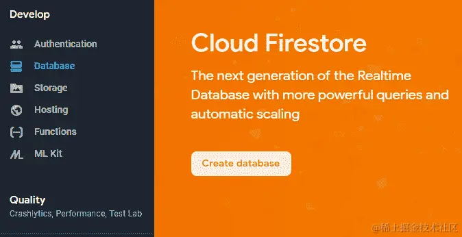 点击“创建项目”后,我们现在可以访问 Firebase 项目。虽然 Firebase 作为云服务提供商不仅仅是一个数据库,还提供存储、托管等功能,但我们只是使用数据库选项。当我们点击数据库链接时,会出现 Cloud Firestore 屏幕,我们需要点击“创建数据库”来开始创建数据库的过程: