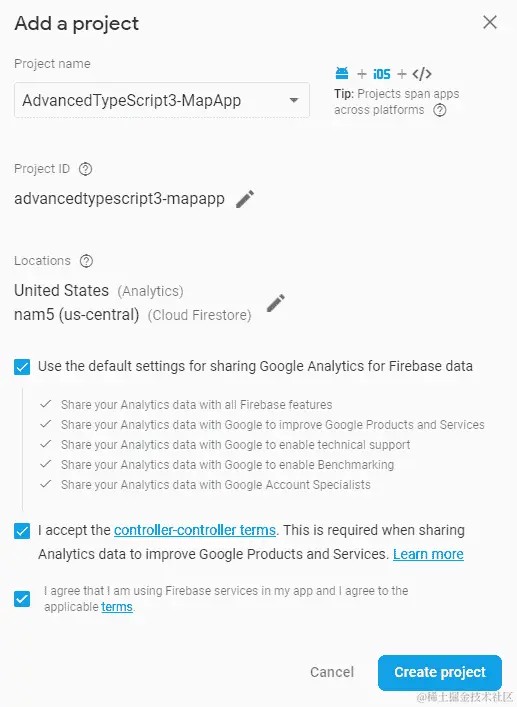 为项目选择一个有意义的名称。在我们创建项目之前,我们应该阅读使用 Firebase 的条款和条件,并在同意时勾选复选框。请注意,如果我们选择共享 Google Analytics 的使用统计数据,我们应该阅读适当的条款和条件,并勾选控制器-控制器条款复选框: