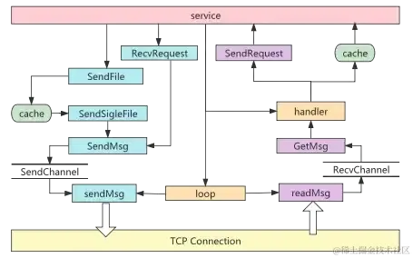 DeOSS 采用面向可靠传输的 TCP 协议作为底层通信协议,在此基础上建立安全可靠的文件传输机制,文件传输协议如下图所示。应用的服务层发起文件发送或接收请求时,首先与接收/发送方建立 TCP 连接,再通过 DeOSS 文件传输协议的握手机制建立文件分片字节流传输通道。