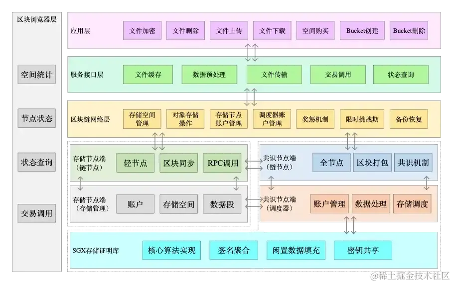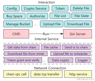 内部服务层处理来自交互层的用户数据文件,提供诸如数据确权、文件分片与冗余、文件声明等预处理程序,并将处理后的内容交由调度程序调度。另一方面,还负责处理来自链端和存储矿工端的数据。