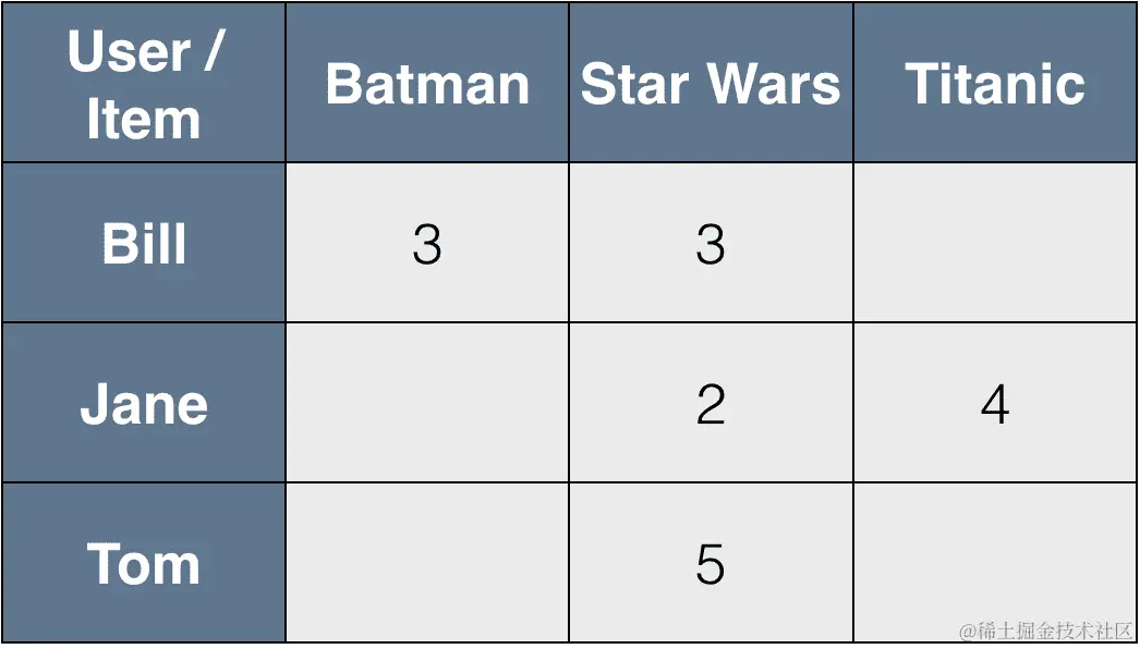 举个简单的例子,假设我们有一组电影的以下用户评分: