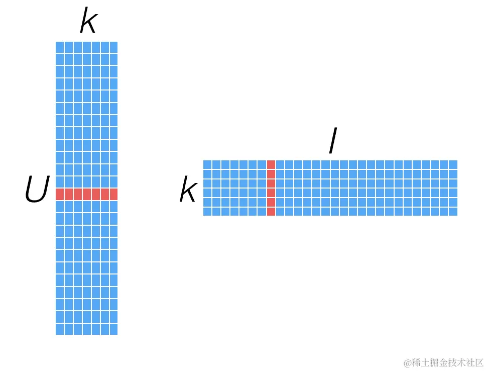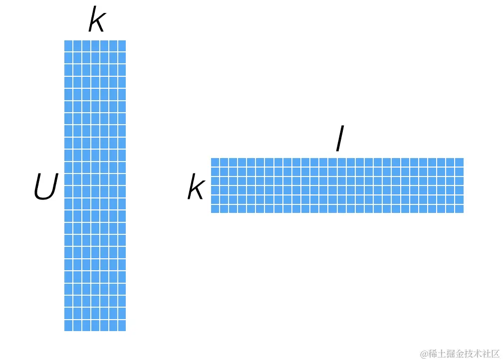 如果我们想要找到一个低维(低秩)的用户-物品矩阵的近似值,维度为k,我们将得到两个矩阵:一个是用户大小为 U x k 的矩阵,另一个是物品大小为 I x k 的矩阵;这些被称为因子矩阵。如果我们将这两个因子矩阵相乘,我们将重构原始评分矩阵的近似版本。请注意,原始评分矩阵通常非常稀疏,而每个因子矩阵是密集的,如下图所示: