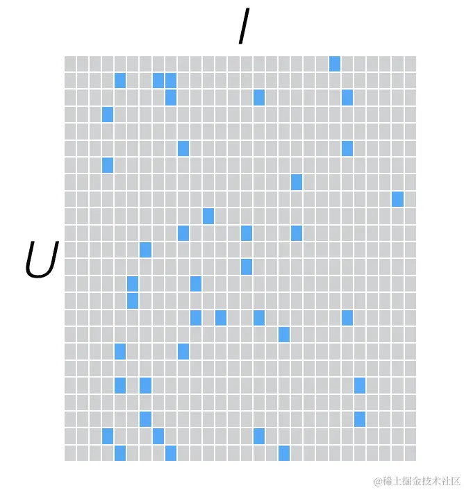 我们可以将这些评分组成一个二维矩阵,以用户为行,物品为列。每个条目表示用户对某个物品的评分。由于在大多数情况下,每个用户只与相对较小的一组物品进行了交互,因此该矩阵只有少数非零条目,即非常稀疏。