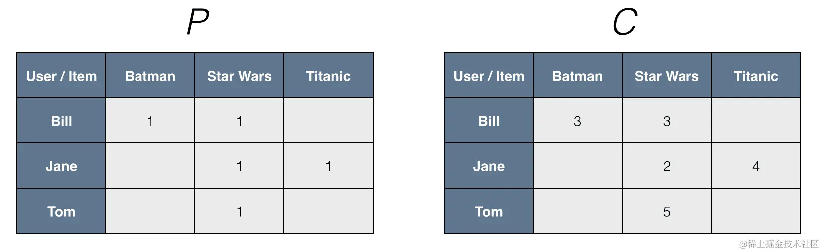 例如,假设我们之前看到的用户-电影评分实际上是每个用户观看该电影的次数。这两个矩阵看起来可能像以下截图中显示的矩阵。在这里,矩阵P告诉我们电影被用户观看了,矩阵C代表置信度加权,以观看次数的形式--通常情况下,用户观看电影的次数越多,他们实际上喜欢它的置信度就越高。