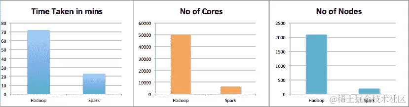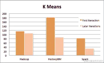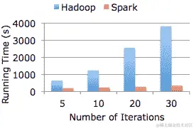 在性能方面,Spark 在相关工作负载方面比 Hadoop 快得多。请参考以下图表: