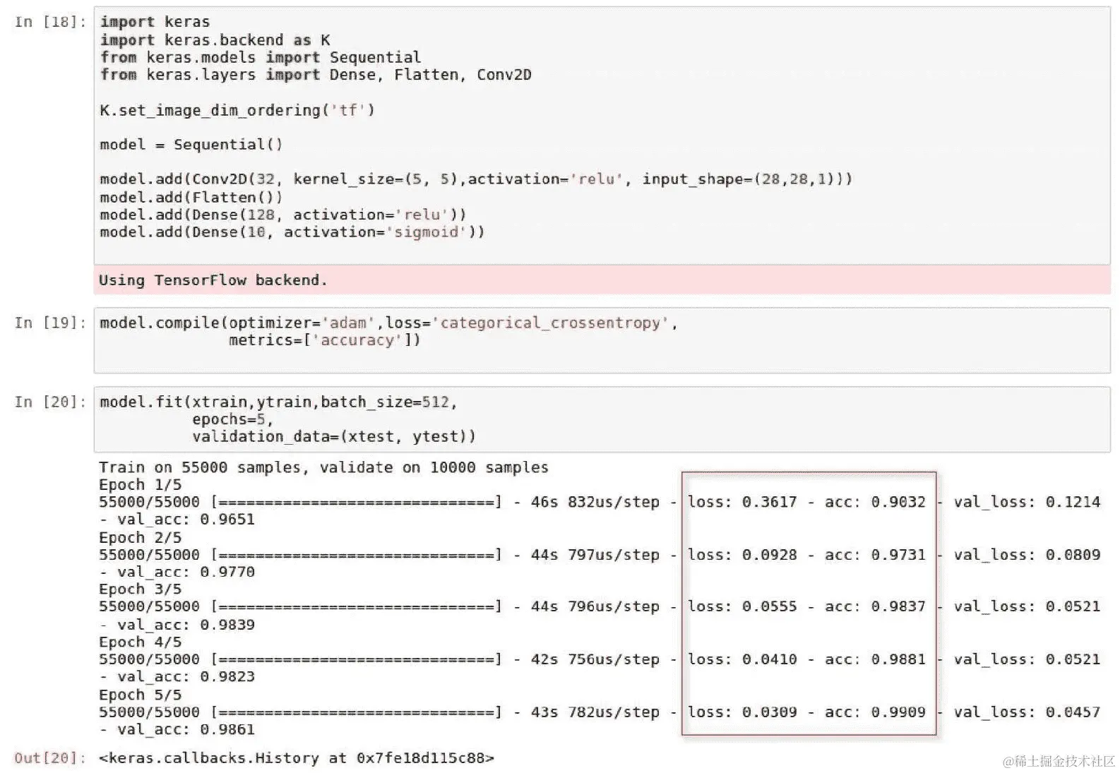 batch_size为512的图像进行5次运行或epochs来训练模型。每个 epoch 的损失和准确性都被捕获,并可以在以下截图中看到: