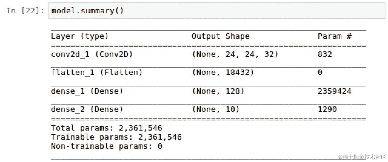我们看到第一层的输出形状(None, 24, 24, 32)通过在第二层中乘以 24 x 24 x 32 而展平为形状(None, 18432)。此外,我们看到我们的第三和第四层具有我们使用 Dense 层函数分配给它们的形状。