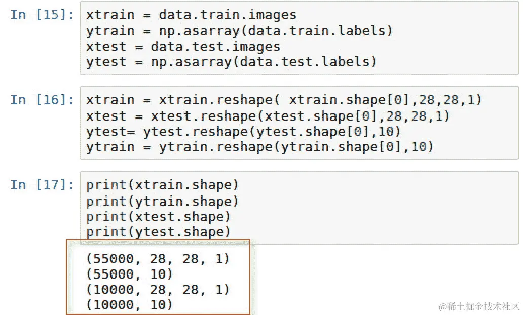 xtrain、xtest、ytrain和ytest的数组目前不是用于 Keras 中的卷积神经网络的正确形状。正如我们在本章早期确定的那样,MNIST 图像的特征表示为 28 x 28 像素图像,标签表示 0 到 9 之间的十个值中的一个。x-arrays 将被重塑为(,28,28,1),y-arrays 将被重塑为(,10)。新数组的shape如下截图所示: