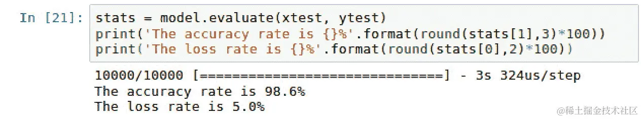 - 我们通过在测试数据集上评估训练模型来计算准确性和损失率,如下截图所示: