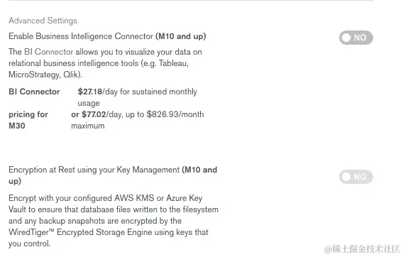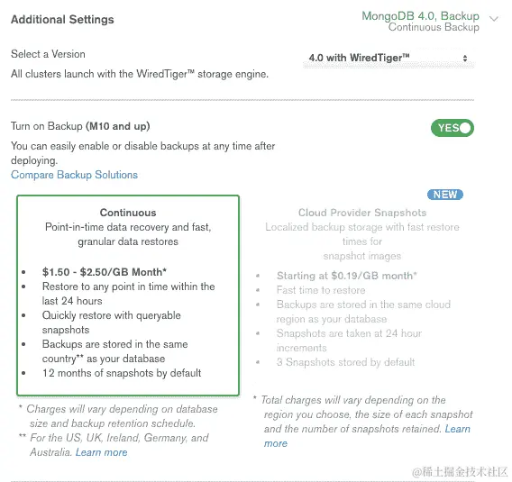 它提供了最新的 MongoDB 版本。唯一的存储选项是 WiredTiger。每个提供商都有多个地区(美国、欧洲和亚洲)。