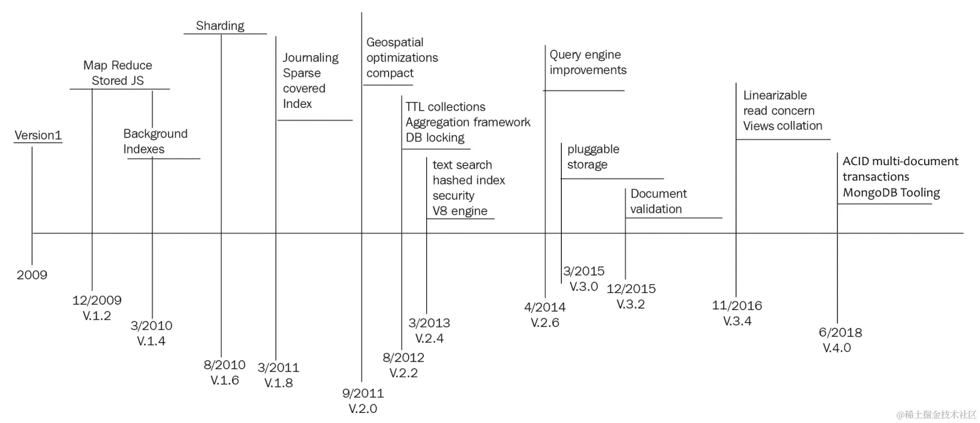 在接下来的章节中,我们将突出 MongoDB 的主要功能,以及它们引入的版本号。
