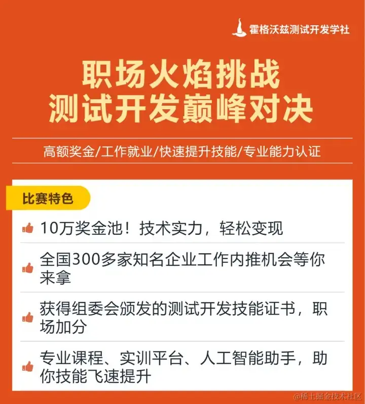职场火焰杯测试开发大赛即将在 5 月 25 日 14:00 至 20:00 火热开赛!这场比赛不仅是展示您技术实力的绝佳机会,更是与同行切磋交流的宝贵平台。我们诚邀您加入这场盛会,共同迎接测试开发领域的巅峰挑战。