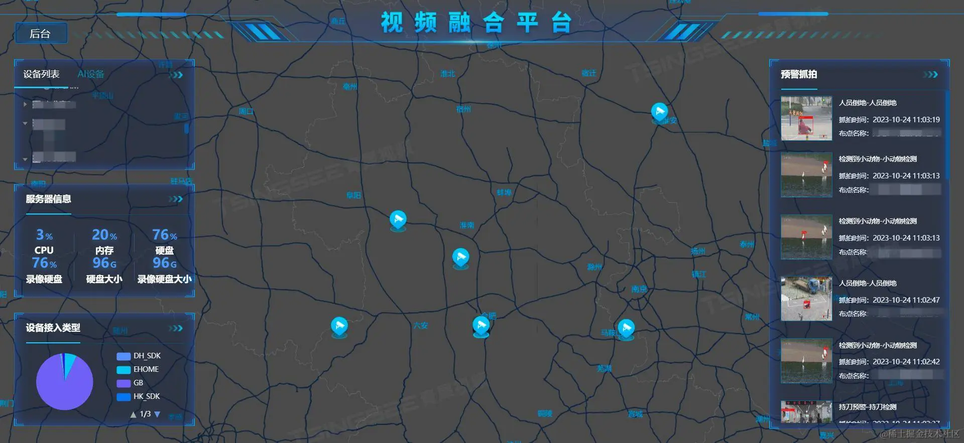 2)多协议接入:支持国标GB/T28181协议、RTMP、RTSP/Onvif协议、海康Ehome、海康SDK、大华SDK、华为SDK、宇视SDK、乐橙SDK、萤石云SDK等。