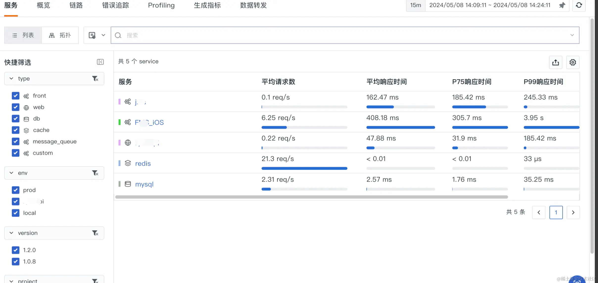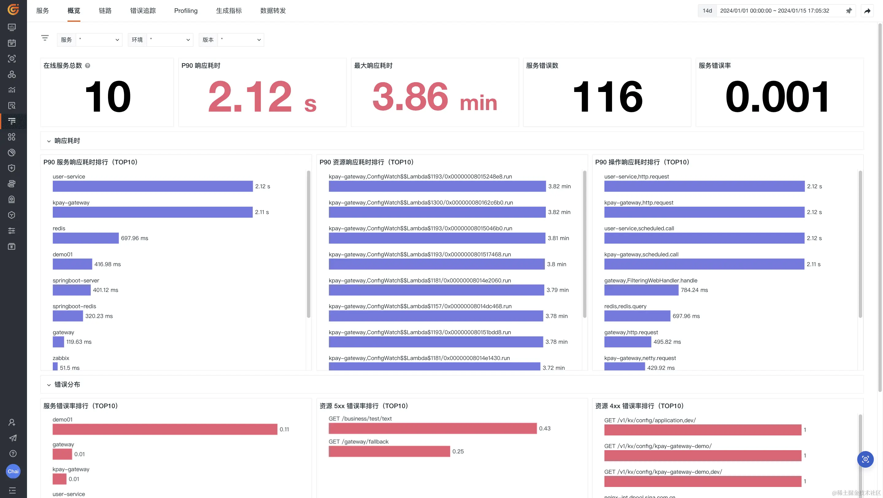 - 统计数据:包括在线服务总数、P90 服务响应耗时、服务最大响应耗时、服务错误数、服务错误率;