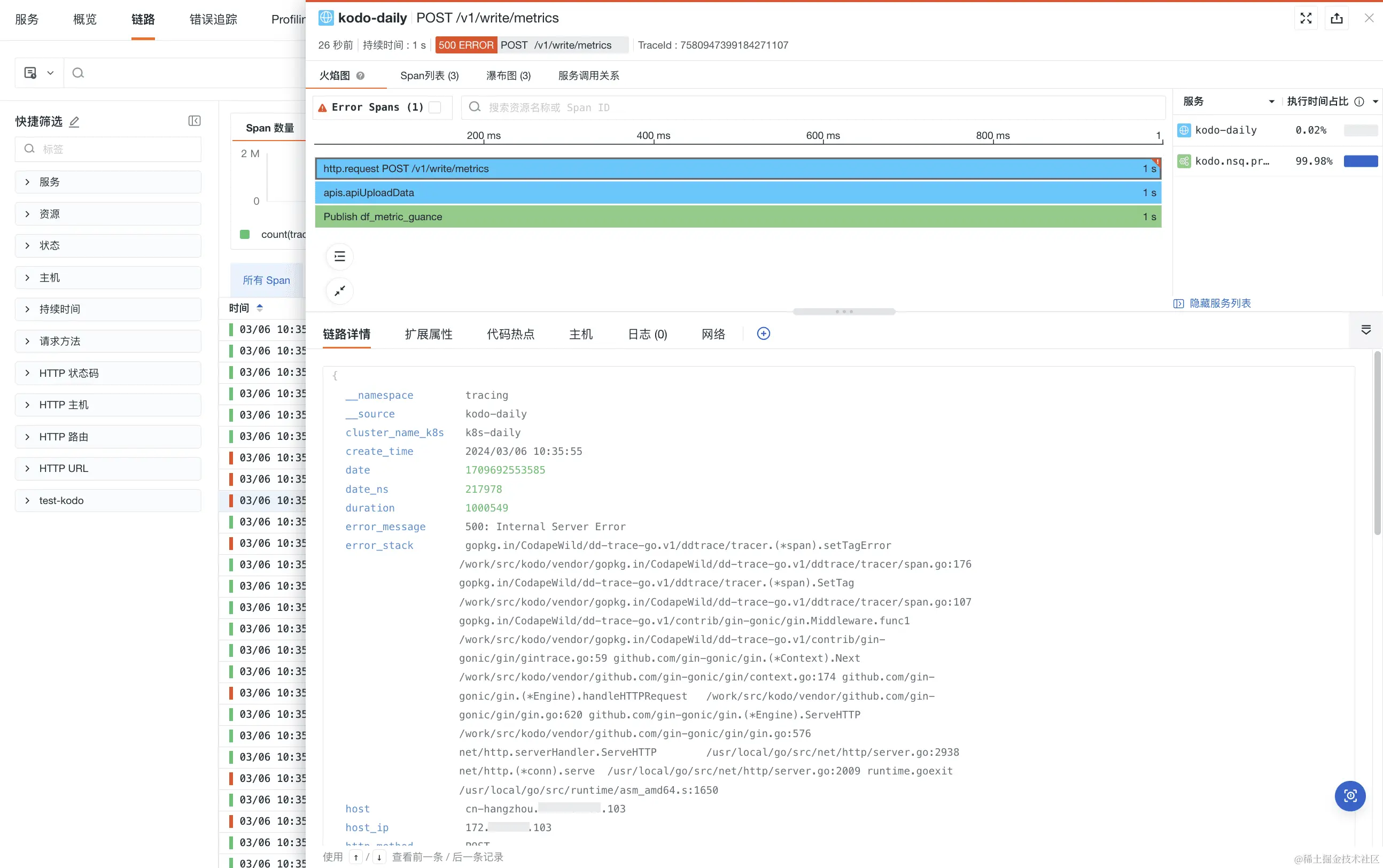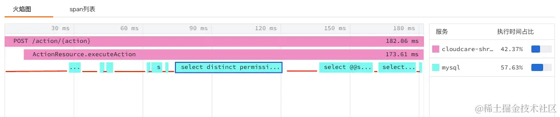 火焰图可清晰展示整条链路中每个 Span 的流转和执行时间。您可以在火焰图右侧查看对应的服务列表及响应时间。点击火焰图的 Span,在链路详情可查看对应的 Json 内容,通过鼠标滚轴缩放可查看具体 Span 信息。