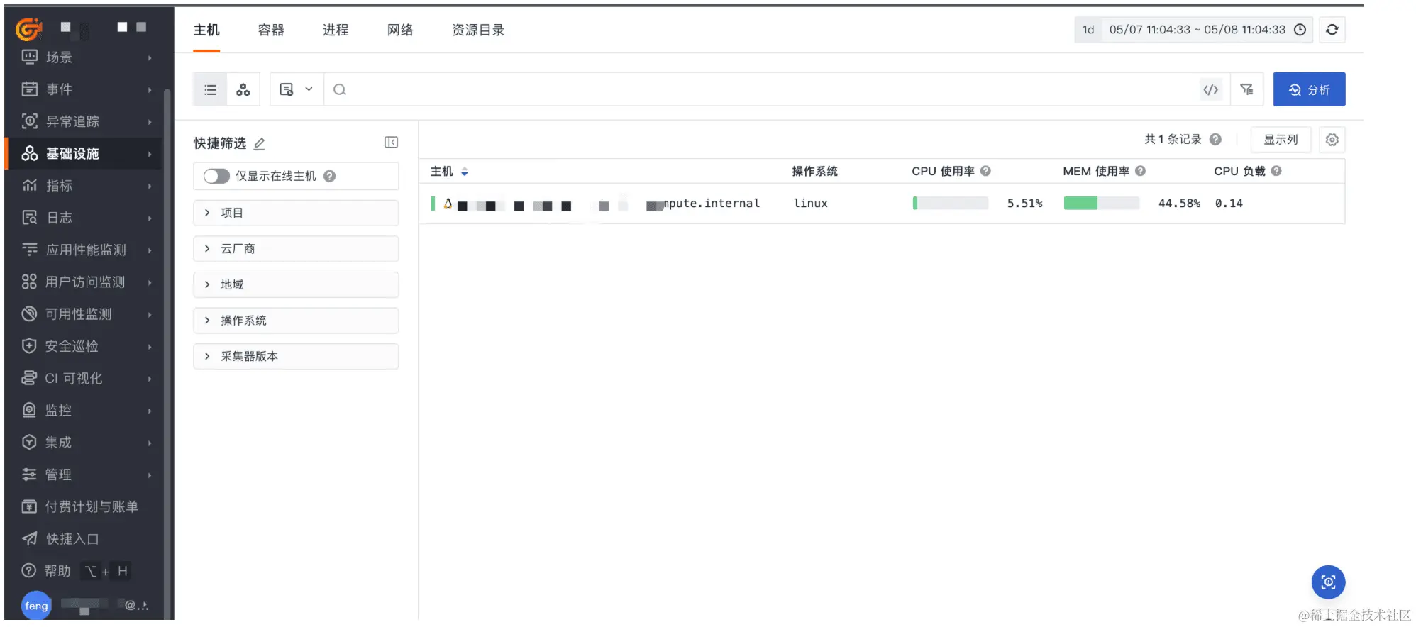 在观测云-基础设施可以看到服务器运行状态,表示安装完成。