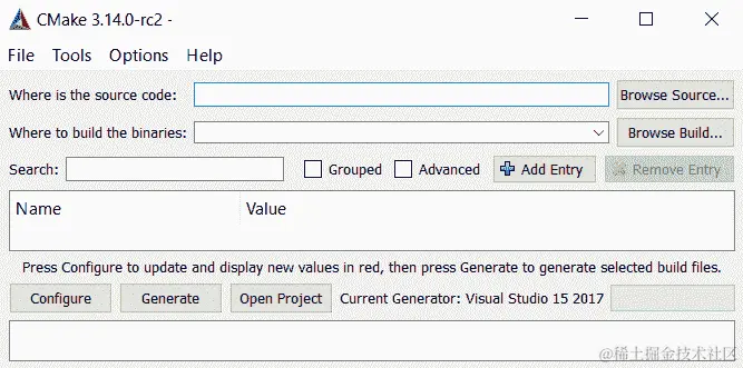 打开 CMake GUI 工具。它应该看起来类似于以下内容: