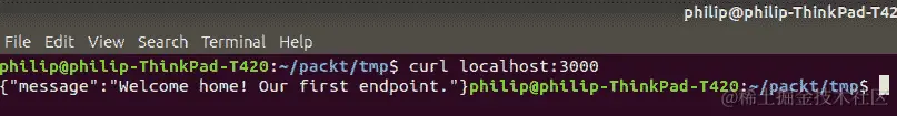 前面的命令使用curl将名称发布到check-in端点。它获取服务器的结果并将其保存到名为TOKEN的 Bash 变量中。TOKEN变量是在运行该命令的终端窗口中本地的;因此,如果关闭终端,则需要再次运行。要检查它是否正确保存,告诉 Bash shell 打印该值: