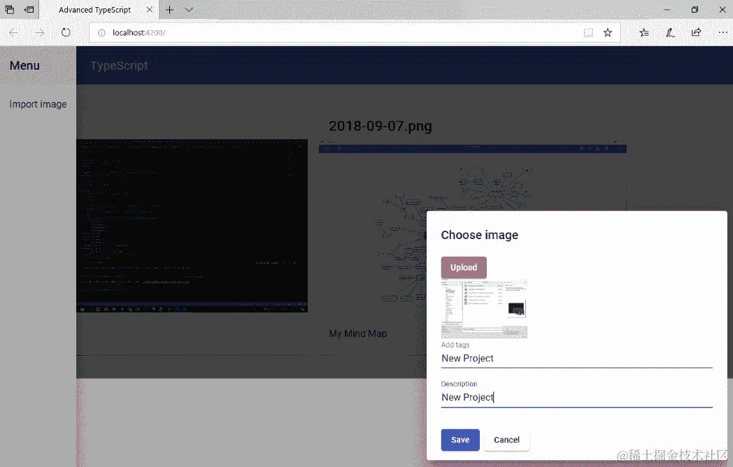 与我们的 HTML 模板相关的更改是在app.component.html中的菜单列表项上添加对ImportImage的调用,通过(click)事件绑定对click事件做出响应。再次看到 Angular 绑定发挥作用: