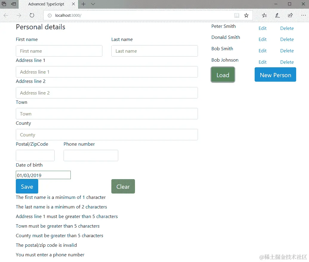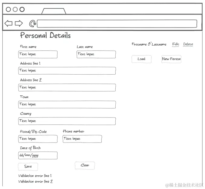 个人详细信息将包括名字和姓氏、地址(由两个地址行、城镇、县和邮政编码组成)、电话号码和出生日期。