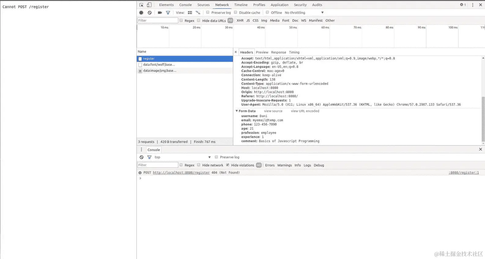 让我们看看如何检查使用POST请求发送的数据。打开 Chrome DevTools 并选择网络选项卡。现在在表单中输入一些详细信息,然后单击提交。您应该在网络请求列表中看到一个名为register的新条目。如果单击它,它将打开一个新面板,其中包含请求详细信息。请求数据将出现在表单数据部分的标头选项卡中。请参考以下屏幕截图: