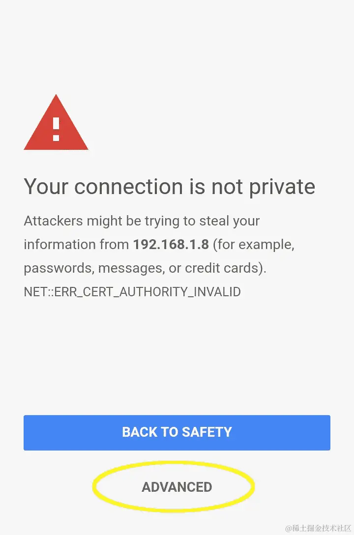 如果您在 Chrome 中打开此页面,您应该会收到类似以下截图的警告。在这种情况下,请选择高级,如下图所示: