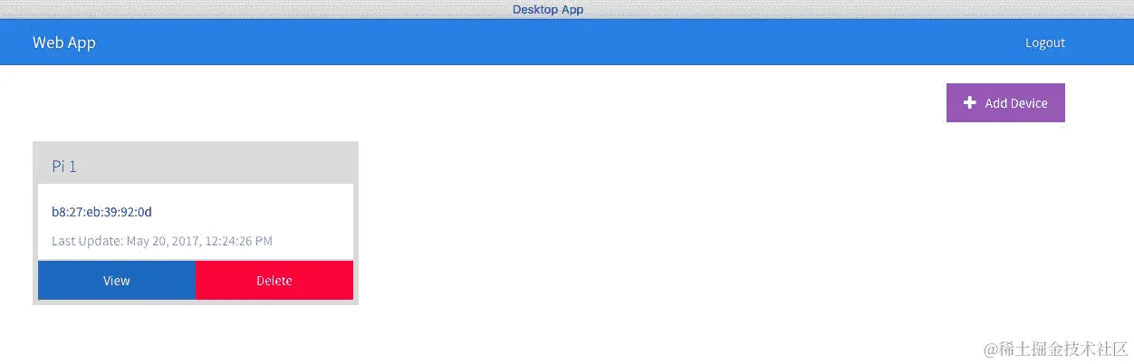 接下来,我们有所需的页面。移动应用程序只实现了登录页面。我们强制用户使用 Web 或桌面应用程序来创建新帐户。mobile-app/src/pages/login/login.ts包括身份验证逻辑。mobile-app/src/pages/home/home.ts包括用户注册的所有设备列表。mobile-app/src/pages/add-device/add-device.ts具有添加新设备所需的逻辑,mobile-app/src/pages/view-device/view-device.ts用于查看设备信息。