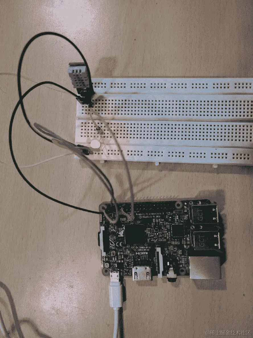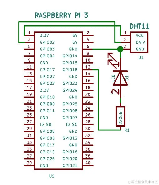 上述是使用 DHT11 传感器和 LED 设置的树莓派 3 的设置。