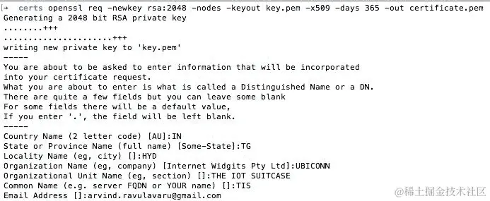 openssl req -newkey rsa:2048 -nodes -keyout key.pem -x509 -days 365 -out certificate.pem