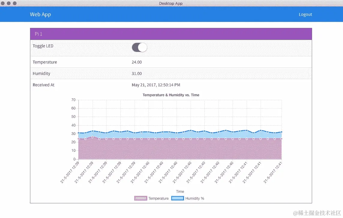 我们在 Web 应用程序和桌面应用程序上工作,并将简单的 LED 和 DHT11 温湿度传感器与树莓派集成,并看到了从一端到另一端的简单流程。我们将温度和湿度实时传输到 Web 应用程序和桌面应用程序,并使用切换按钮打开了 LED。
