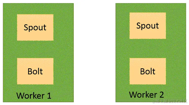 让我们考虑一个包含一个 spout 和一个 bolt 的示例拓扑,两个组件都有两个执行器。如果我们通过分配两个工作节点(监督者插槽)提交了拓扑,下图显示了执行器的分配: